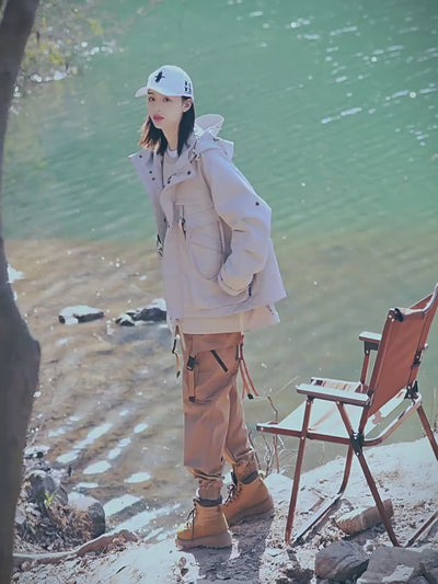 サイバーパンクの無骨さと近未来的な要素が融合した、ルーズフィットシルエットのテクニカルパーカーです。ドロップショルダーとゆったりとしたボディラインが特徴で、リラックス感がありながらも都会的で洗練された雰囲気を演出します。フードは収納可能なデザインで、ドローコードで調整が可能。首元はスタンドカラーで、急な気候の変化にも対応しつつ、多様なスタイリングを楽しめます。フロントには複数の立体的なパッチポケットとスナップボタン式のフラップデザインが配され、機能性と都会的なエッジを融合。L字型のサイドポケットも特徴的です。第三者から見ると、「まるで未来都市の特殊部隊が着用するような、クールで機能的なアウター」と感じさせるでしょう。通常バリエーションに加え、取り外し可能な中綿ライナー(フリース素材)を備えた中綿仕様もございます。これにより、春・秋はライトアウターとして、冬は中綿ライナーを装着して暖かく着用できるため、幅広いシーズンで活躍します。