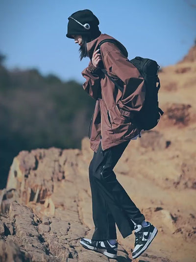 サイバーパンクの無骨さと近未来的な要素が融合した、ルーズフィットシルエットのテクニカルパーカーです。ドロップショルダーとゆったりとしたボディラインが特徴で、リラックス感がありながらも都会的で洗練された雰囲気を演出します。フードは深く、首元まで覆うような形状で、ドローコードで調整が可能。胸元からサイドにかけて複数の機能的なジッパーポケットとフラップポケットがアシンメトリーに配され、都会的なエッジと実用性を兼ね備えています。第三者から見ると、「まるで未来都市の探索者やタスクフォースの隊員が着用するような、クールで機能的なアウター」と感じさせるでしょう。防水機能とノンアイロン加工が施されており、お手入れが簡単で、春秋の肌寒い時期から活躍し、日常使いから活動的なシーンまで幅広く対応します。
