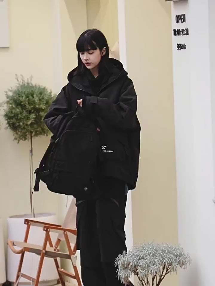 サイバーパンクの無骨さと近未来的な要素が融合した、ルーズフィットシルエットのテクニカルジャケットです。ドロップショルダーとゆったりとしたボディラインが特徴で、リラックス感がありながらも都会的で洗練された雰囲気を演出します。フードはドローコードで調整可能で、首元は高めのスタンドカラー。フロントには複数の立体的なパッチポケット、ジッパーポケット、そしてストラップやバックルディテールが非対称に配され、機能性と都会的なエッジを融合。まるで未来の装備品を思わせる無骨でクールな雰囲気を醸し出しています。第三者から見ると、「まるで未来都市の特殊部隊や探索者が着用するような、クールで機能的なアウター」と感じさせるでしょう。通常の厚みで、春秋の肌寒い時期に最適で、日常使いからストリートでの活動まで幅広く対応し、Tシャツやパーカーの上に羽織るだけで、一気にスタイリッシュで個性的なスタイルが完成します。