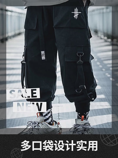 この「サイバー・ネクロムーブジョガー」は、近未来の暗闇を駆け抜ける闇の忍者が纏うような、厨二病感あふれるカーゴパンツだ。中低ウエストのゆったりとした腰回りから、足元へと鋭くテーパードするシルエットが特徴で、束脚デザインはまるで影に溶け込むかのような機動性を予感させる。サイドに大胆に配置された複数の機能的カーゴポケット、そしてDリングやストラップ装飾は、見る者に未来の兵士の過酷なミッションを連想させるだろう。第三者からは「まるでゲームの世界から飛び出してきたような、圧倒的な存在感を放つボトムス」と映るはずだ。微ストレッチとノンアイロン加工により、日常のあらゆる活動をサポートし、オールシーズン、君のストリートスタイルを唯一無二のダークヒーローに変貌させる。